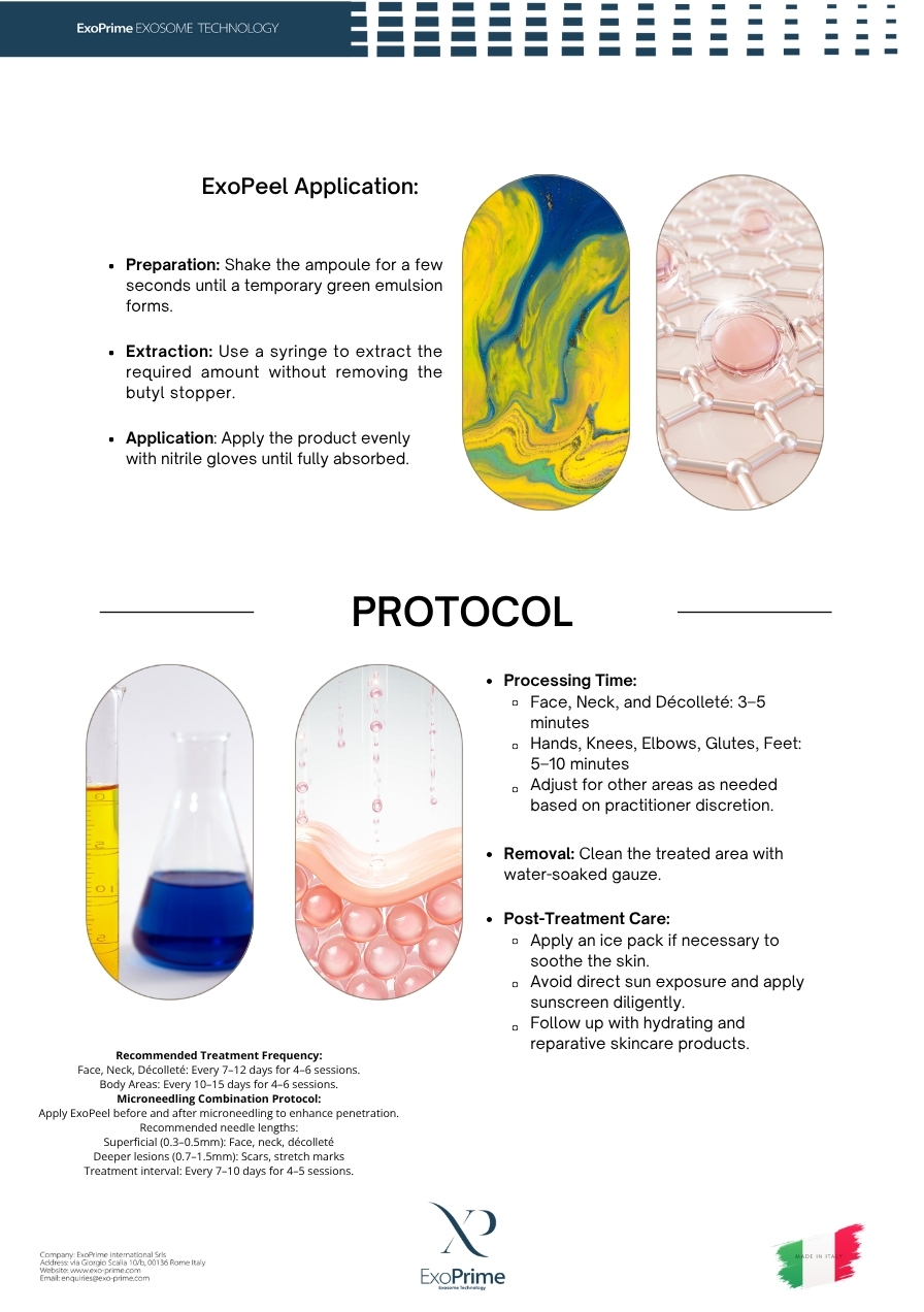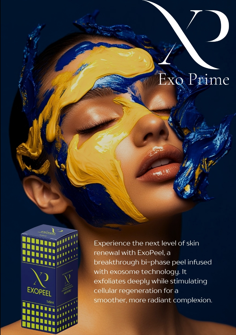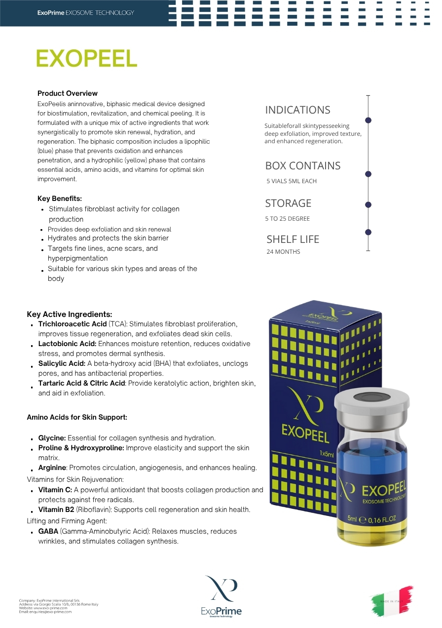 ExoPeel is an innovative, biphasic medical device designed for biostimulation, revitalization, and chemical peeling. It is formulated with a unique mix of active ingredients that work synergistically to promote skin renewal, hydration, and regeneration. The biphasic composition includes a lipophilic (blue) phase that prevents oxidation and enhances penetration, and a hydrophilic (yellow) phasethat contains essential acids, amino acids, and vitamins for optimal skin improvement.Key Benefits: