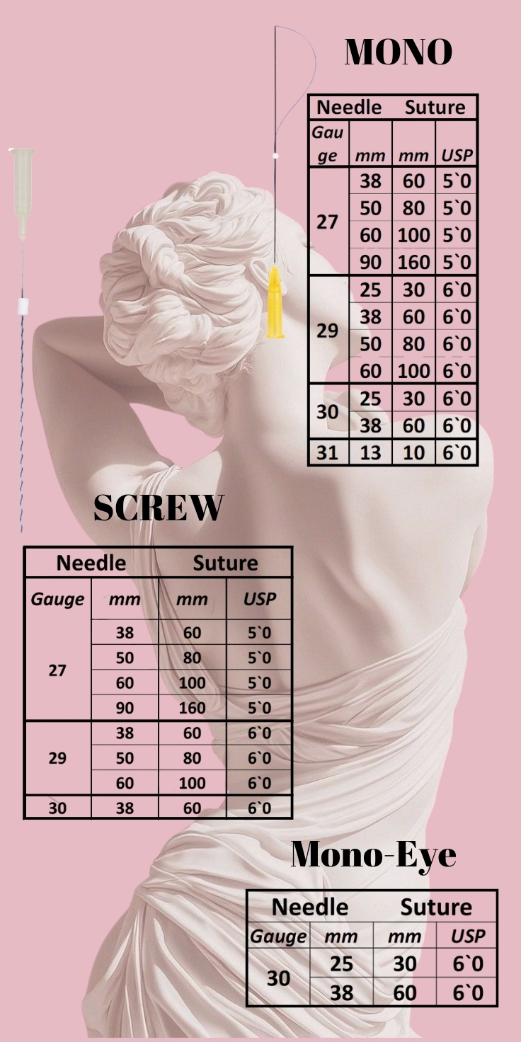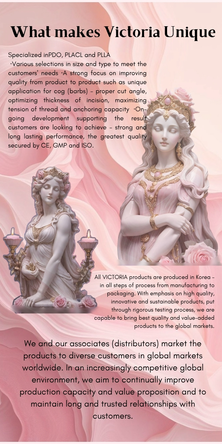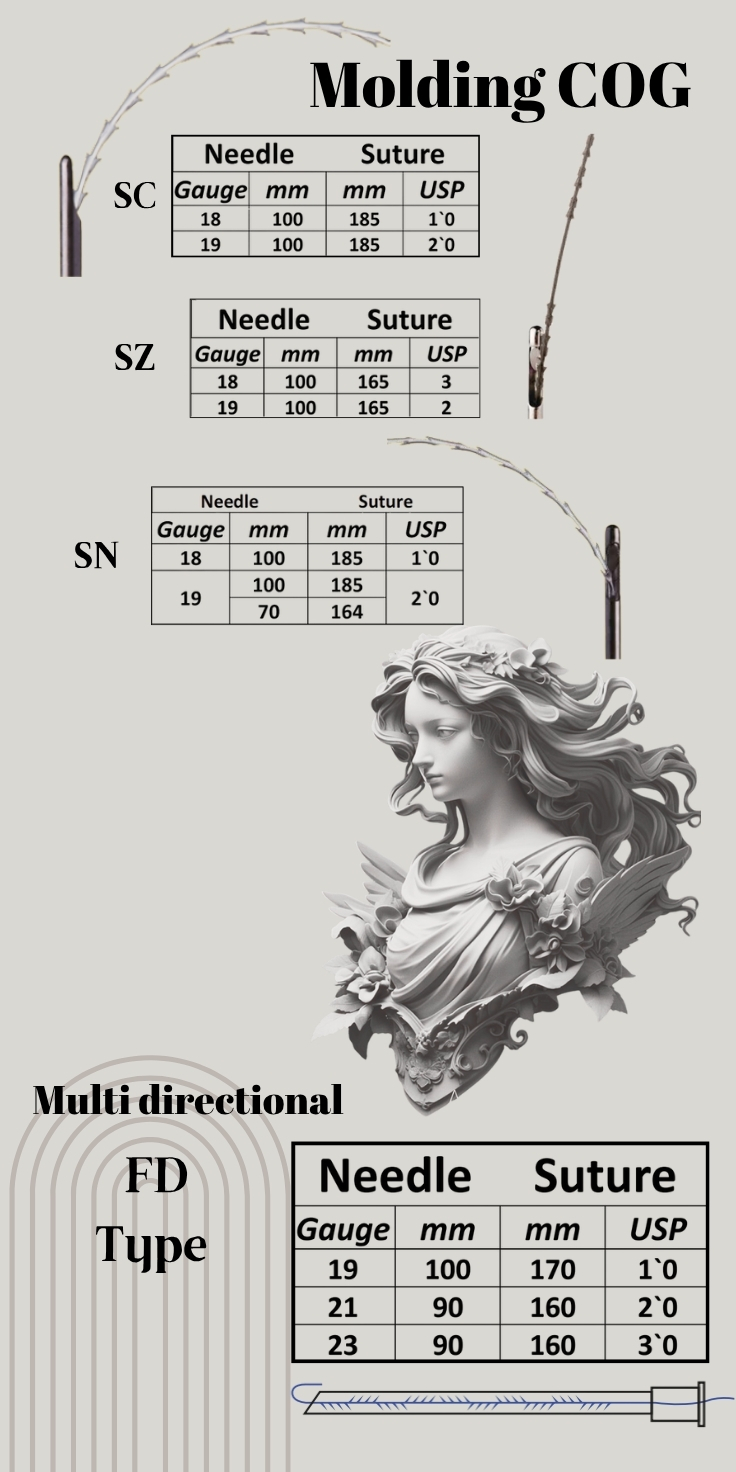 Specialized in PDO, PLACL and PLLA · Various selections in size and type to meet customers' needs · A strong focus on improving quality from product to product such as unique application for cog (barbs) – proper cut angle, optimizing thickness of incision, maximizing tension of thread and anchoring capacity